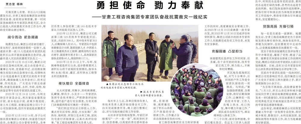 1月15日,《甘肅日報(bào)》第4版刊載《勇?lián)姑?勠力奉獻(xiàn)——甘肅工程咨詢集團(tuán)專家團(tuán)隊(duì)奮戰(zhàn)抗震救災(zāi)一線紀(jì)實(shí)》。該報(bào)道全面反映了集團(tuán)公司黨委心系災(zāi)區(qū)、聞令而動的一系列擔(dān)當(dāng)作為務(wù)實(shí)舉措,深度展現(xiàn)了專家團(tuán)隊(duì)和干部職工向險(xiǎn)而行、甘于奉獻(xiàn)的抗震救災(zāi)生動實(shí)踐,進(jìn)一步凝聚起奮力奪取抗震救災(zāi)全面勝利的強(qiáng)大力量。