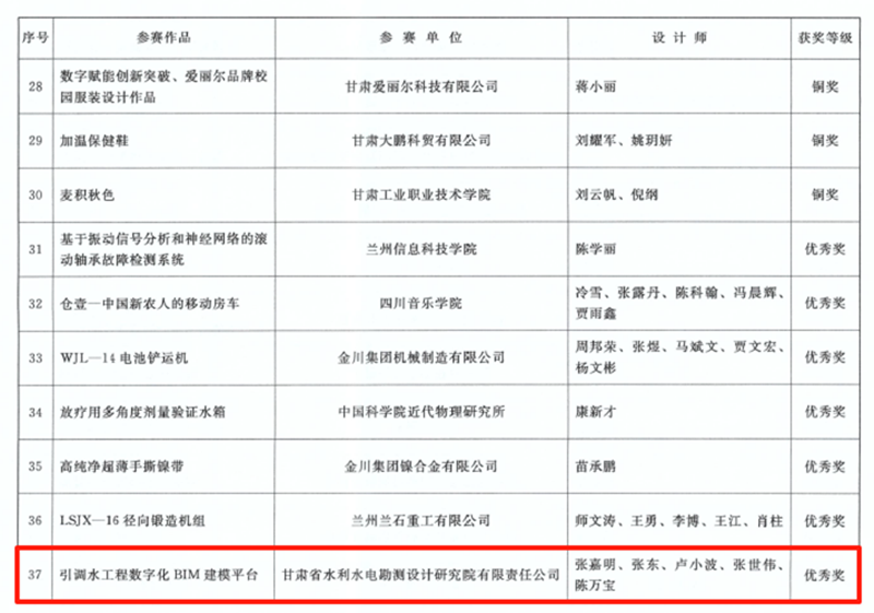 在甘肅省第七屆BIM技術應用大賽中,建筑設計院、水電設計院報送的項目共斬獲12項獎勵,包攬了設計組16個獎項中的10項。在甘肅省第五屆“創(chuàng)新杯”工業(yè)設計大賽中,水電設計院《引調(diào)水工程數(shù)字化BIM建模平臺》項目獲優(yōu)秀獎。在第十七屆全省職工優(yōu)秀技術創(chuàng)新成果獎中,水電設計院、土木工程院申報的兩個項目分獲創(chuàng)新成果獎三等獎,其中,《棄渣場三維設計平臺》項目是全省水利系統(tǒng)唯一獲獎成果。