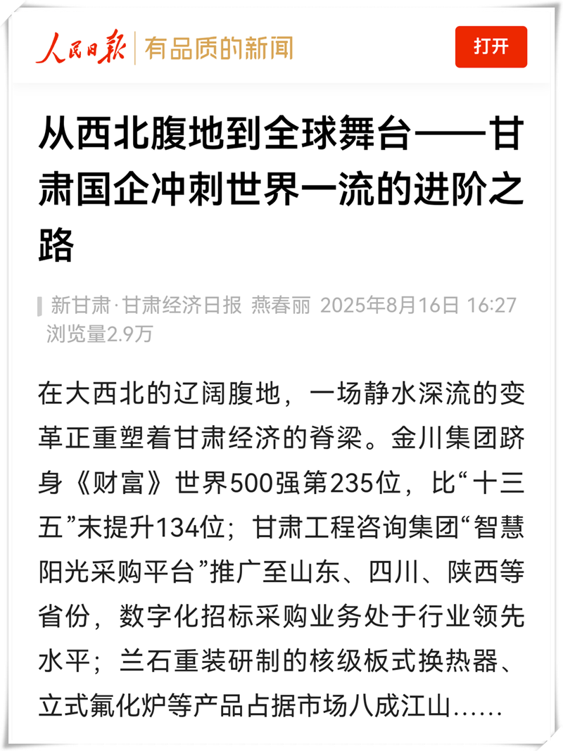 從世界500強(qiáng)的跨越到全國(guó)市場(chǎng)的深耕,從技術(shù)平臺(tái)的輸出到核心產(chǎn)品的壟斷,這些看似分散的閃光點(diǎn),實(shí)則是甘肅國(guó)企在不同賽道上奮力奔跑的足跡。這些閃光的坐標(biāo),共同勾勒出甘肅國(guó)企向世界一流奮力攀登的壯闊圖景。